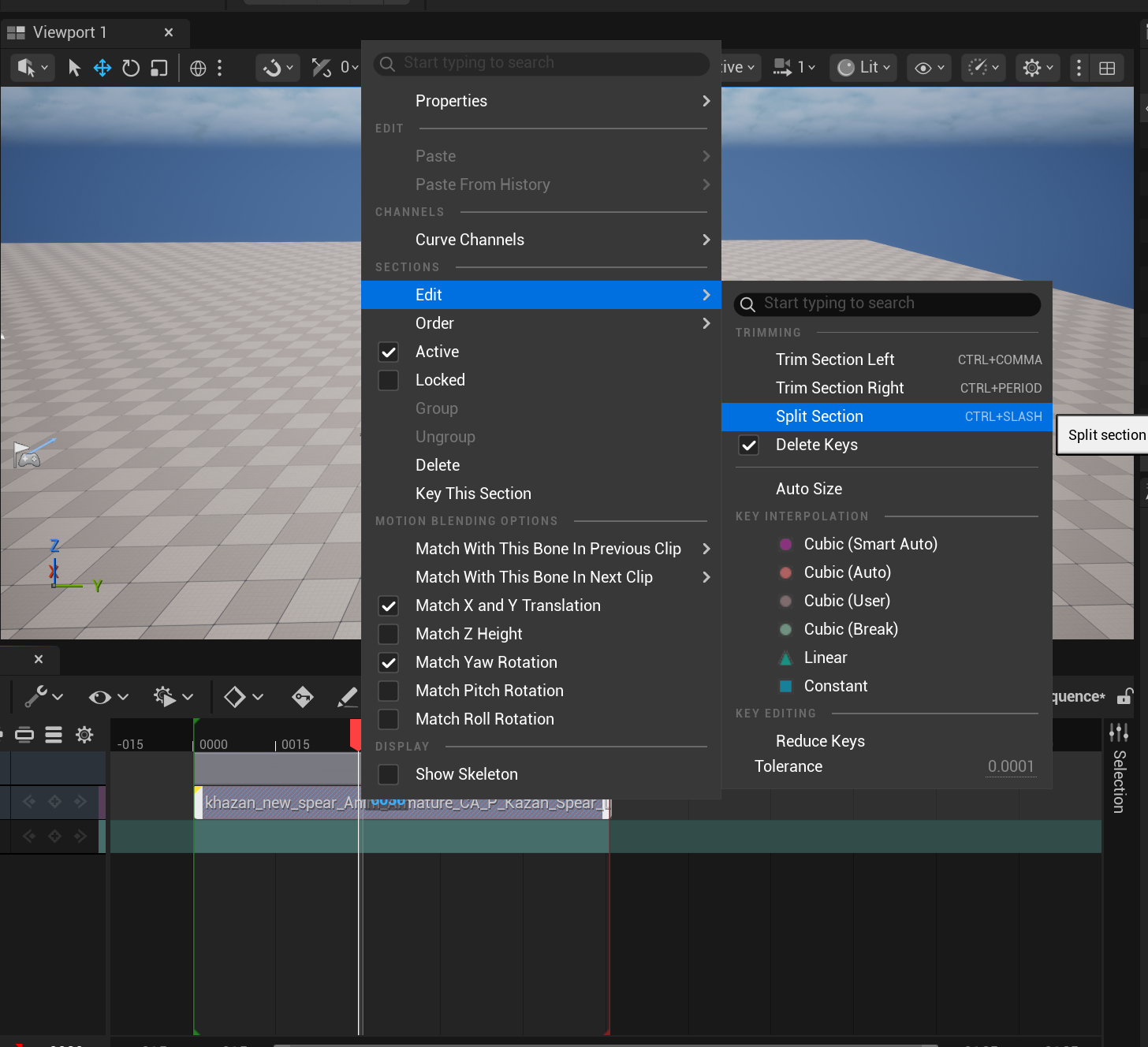 해당 애니메이션 트랙을 마우스 우클릭을 한 뒤 같이 원하는 부분의 프레임의 섹션을 두 부분으로 나누어 줄 수 있으며 단축키로는 "Ctrl + /" 이다. ( 이 때 나눠지는 섹션의 기준은 Drag Bar의 현재 위치를 기준으로 나누어진다.)