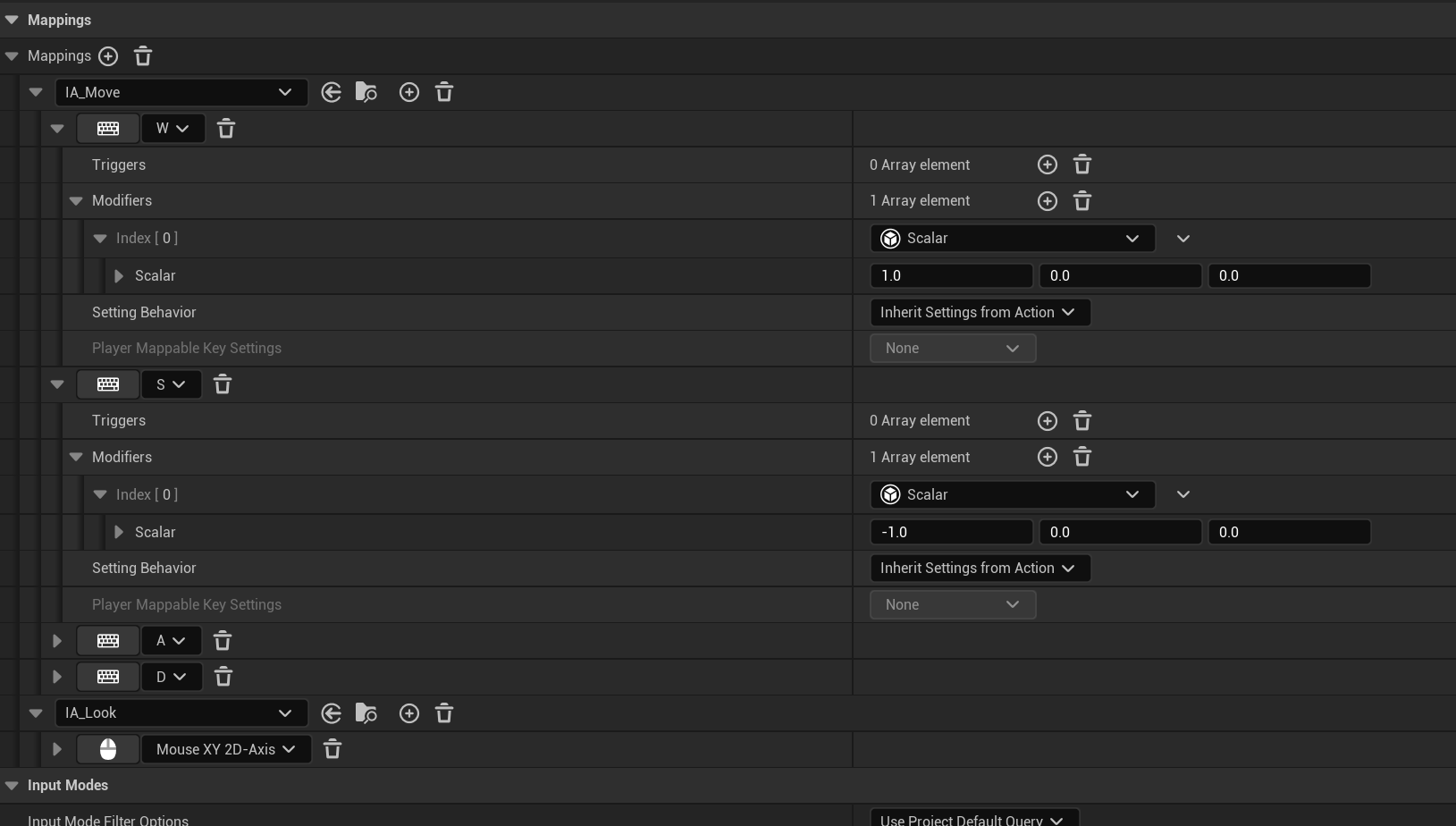 IA_Move라는 Input Action은‘W’ 키 입력 시 호출되도록 설정되어 있다. 또한, Scalar 값을 이용해 키 입력으로 전달되는 값을 스케일링(배율 조정) 하여 이동 방향의 크기와 방향을 제어할 수 있다.