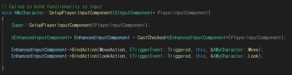 해당 코드 사진을 보면 SetupPlayerInputComponent가 pawn 클래스를 상속받은 Character가 해당 함수를 오버라이드 하여 실 행된다.