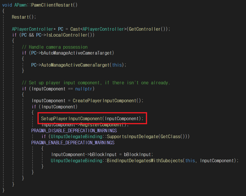 SetupPlayerInputComponent 함수는 Pawn 클래스의 PawnClientRestart() 함수 호출을 통해 한 번 호출되는데