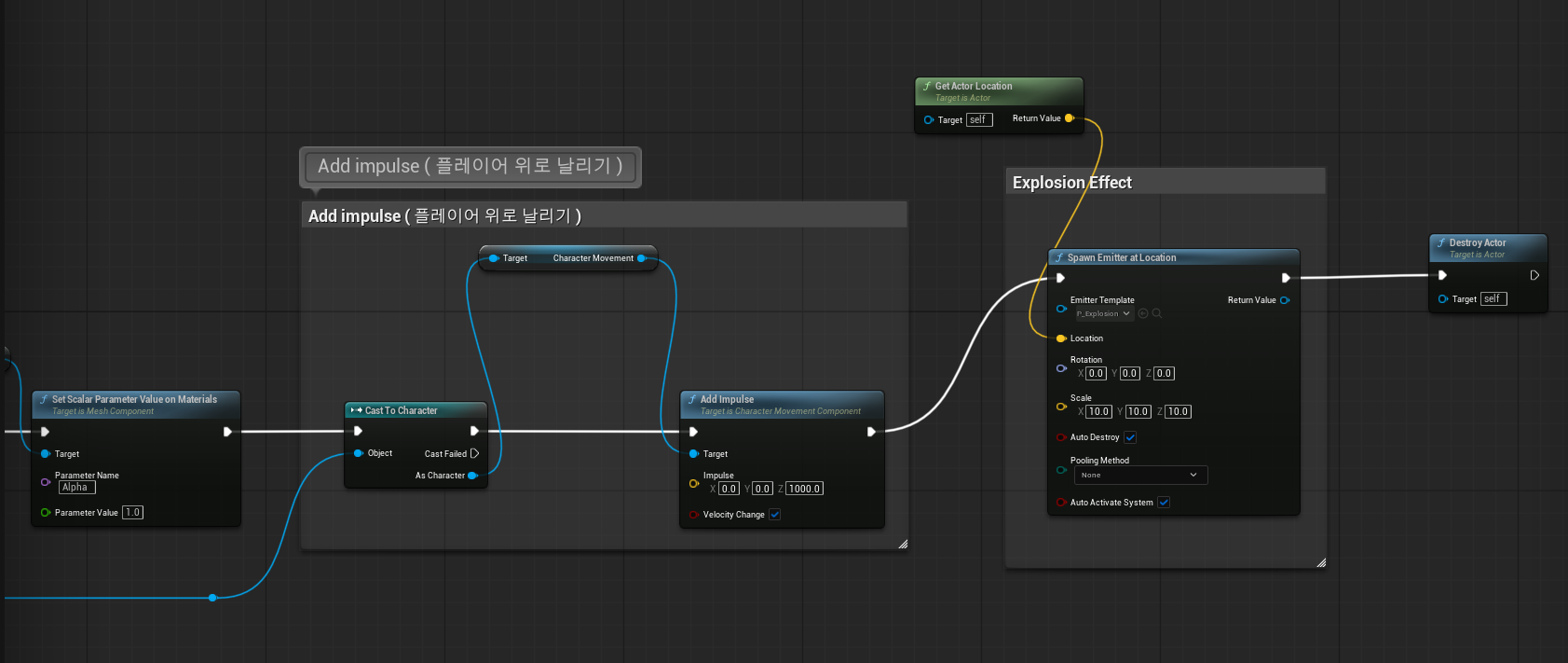 플레이어의 움직임을 제어해야 하므로 Cast 노드를 추가하여 Character로 casting한 후 노드 줄 뽑은 상태에서 Add Impulse를 추가하면 된다.