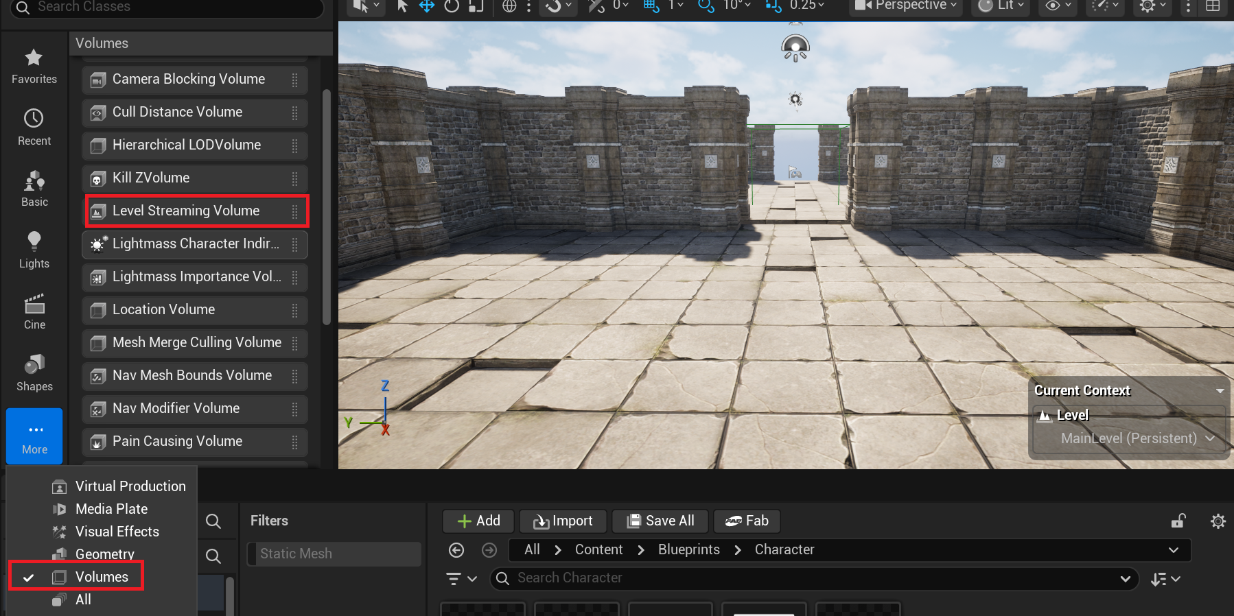해당 방식을 추가하기 위해서는 해당 맵을 클릭후 왼쪽 Place Actor 창에서 Volumes 항목에서 Trigger Volume을 추가하면 된다