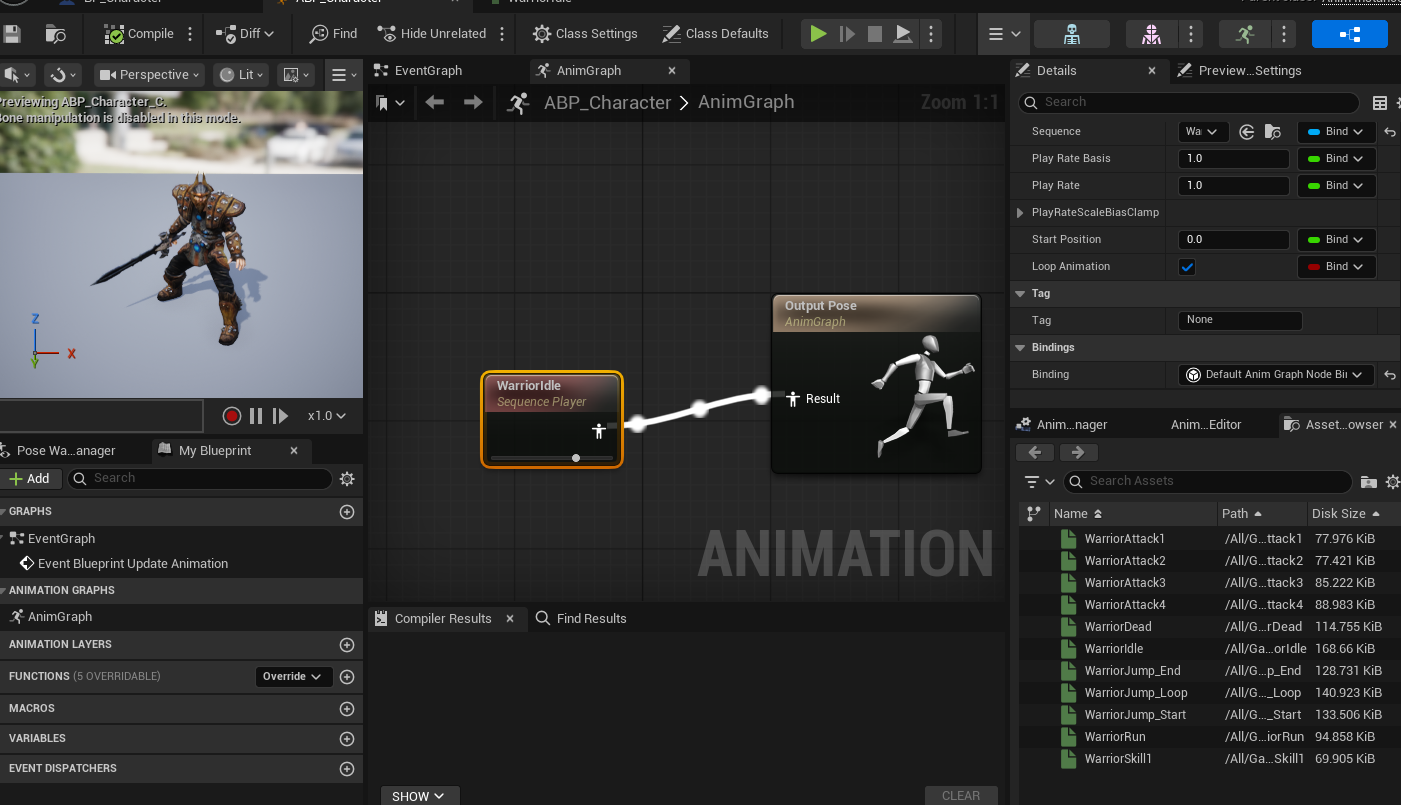 → AnimGraph는 Event Graph에서 계산된 값을 기반으로 실제 애니메이션을 조합하고 최종 포즈를 만들어 출력하는 역할을 한다.