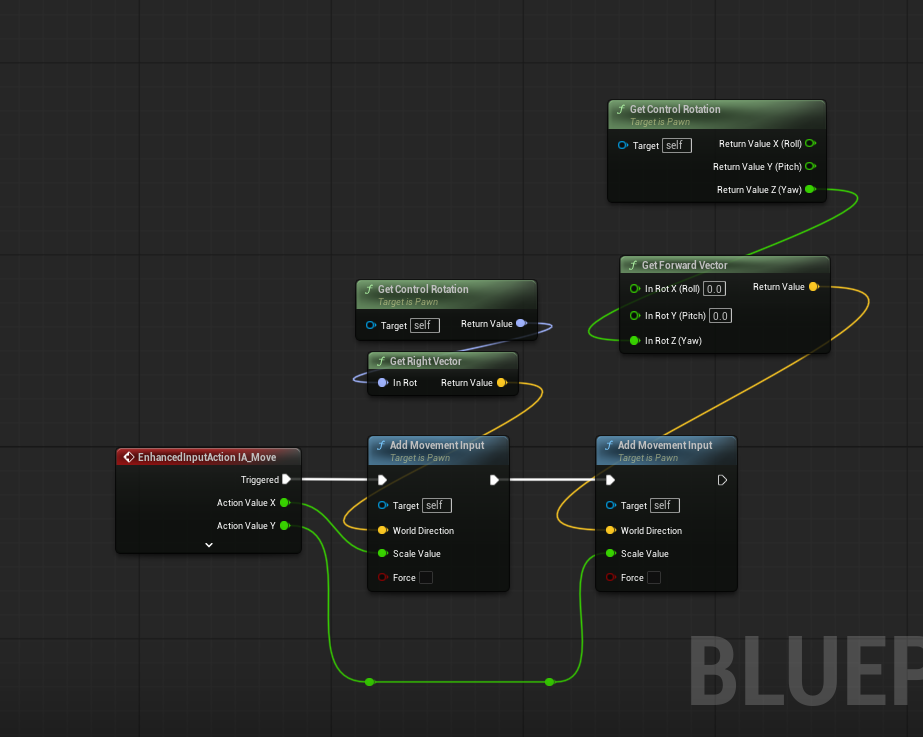 입력 값은 Vector2D로 전달되기 때문에, 이를 각각 분리하여 앞/뒤 이동(Y축) 과 좌/우 이동(X축)에 사용합니다.