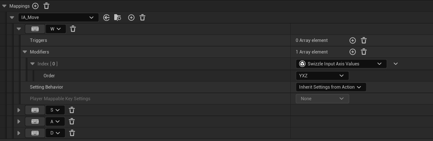W/S 입력을 Y축으로 사용하고 싶다면 Swizzle을 통해 해당 값을 Y축으로 전달하도록 설정합니다.