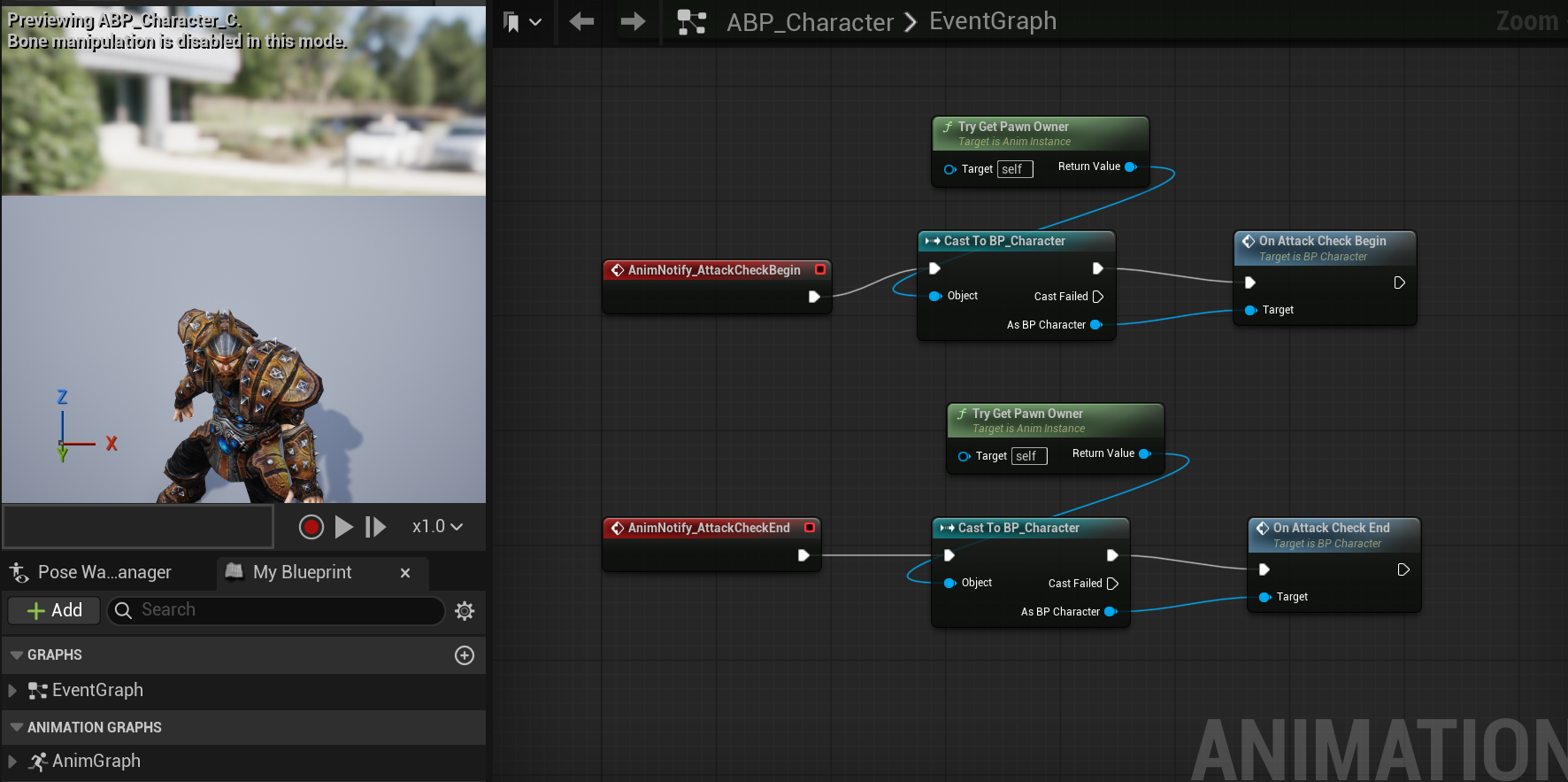 - 현재 애니메이션을 재생 중인 Pawn을 가져온 뒤, Character로 캐스팅 한다.