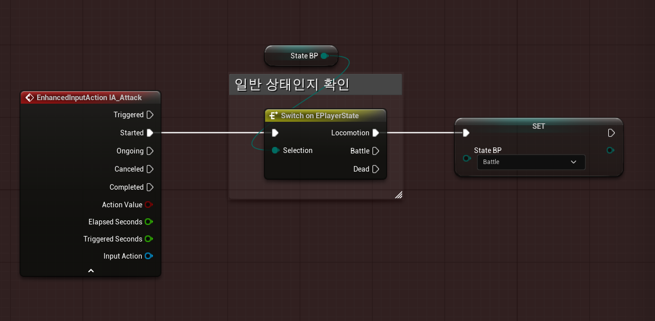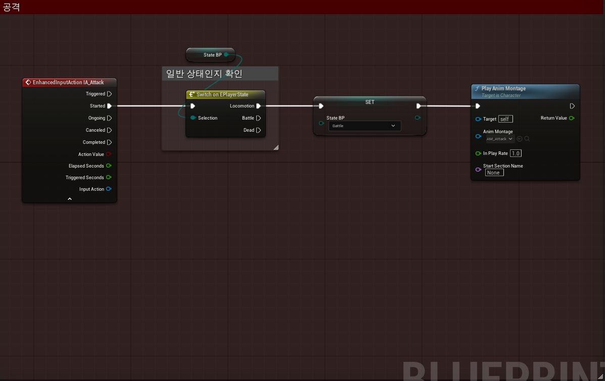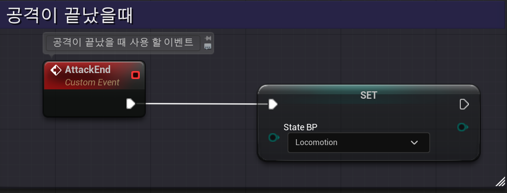 다음은 Customer Event를 통한 공격이 끝났을 때는 다시 상태를 Locomotion으로 설정하는 블루프린트이다.