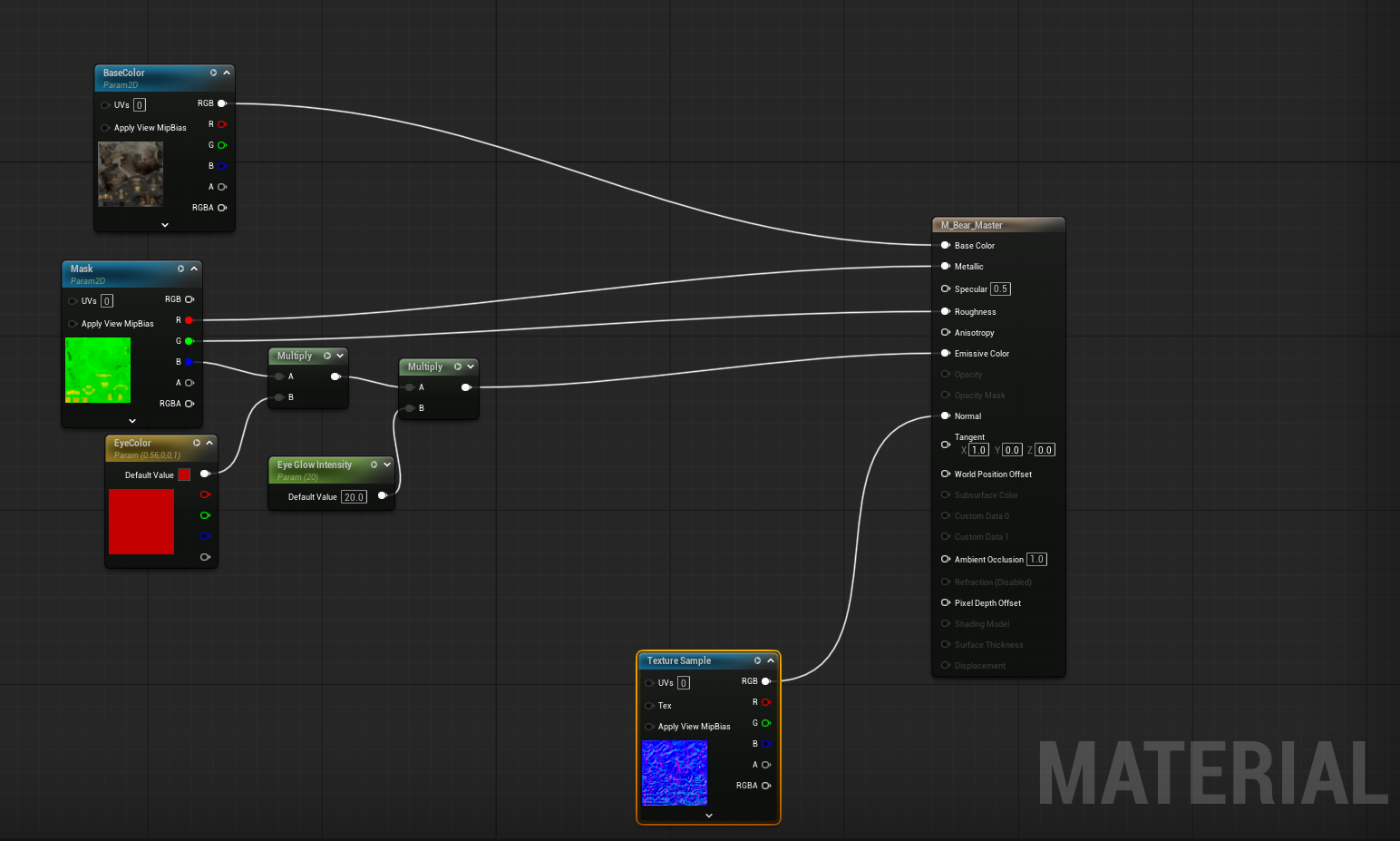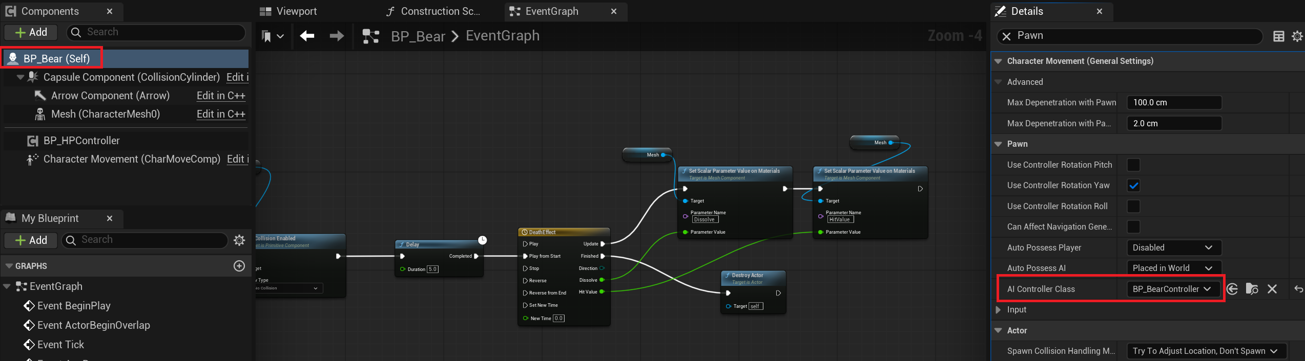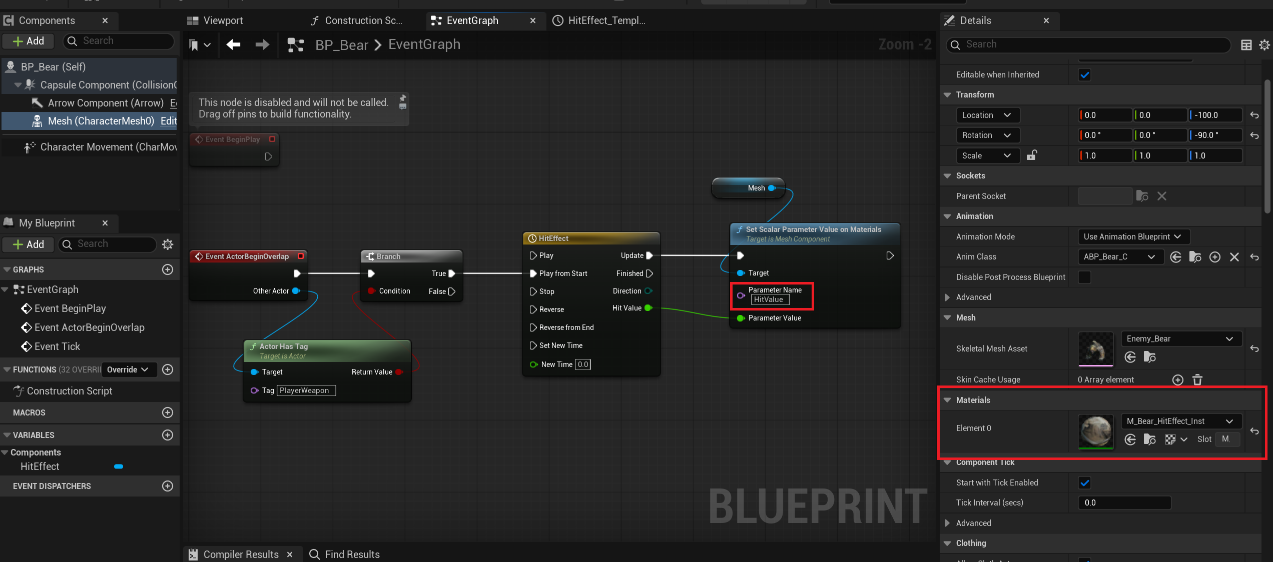 위와 같이 노드를 설정하고 나서 BP_Bear에서 다음과 같이 Material Parameter 로직 처리를 진행한다.