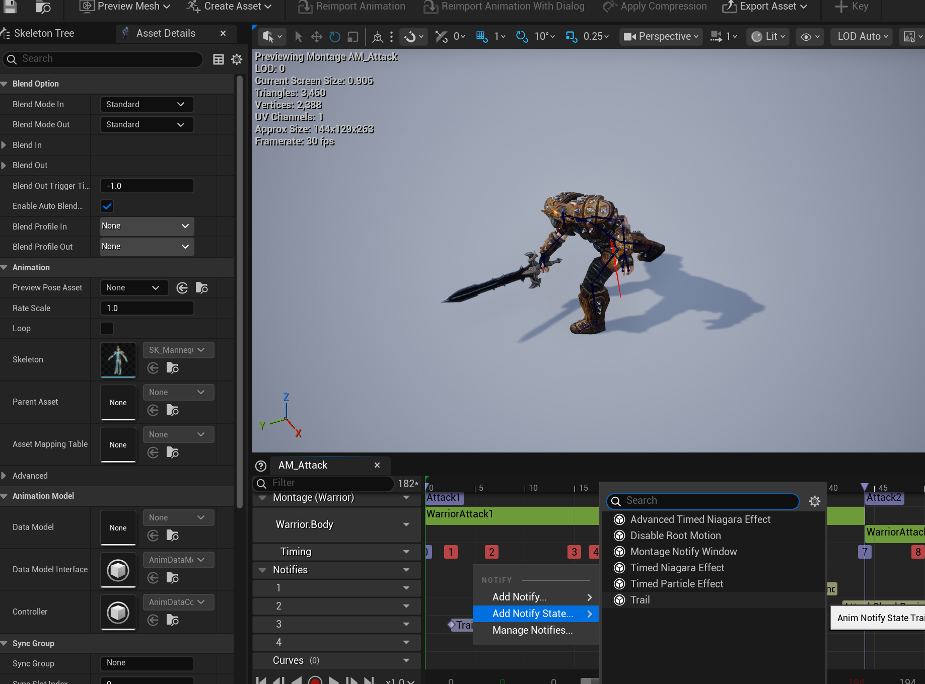 Trail이 나올 위치 설정을 Trail notify를 클릭 후 Detail에서 사용할 trail effect와 소켓 위치 설정해주기