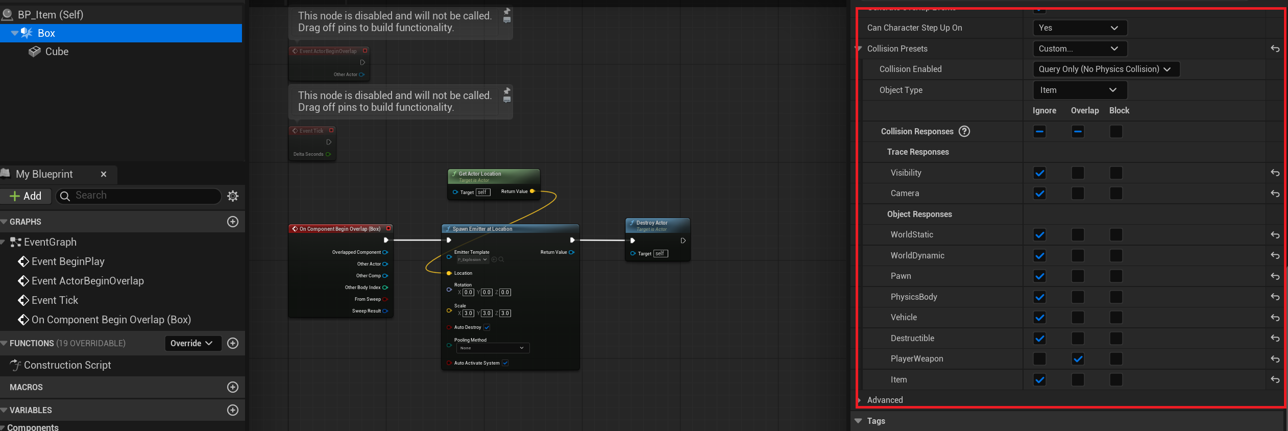 다음과 같이 세부 설정을 한다 Object Type은 Item이고 Player Weapon만 충돌 처리를 할 수 있도록 설정하고