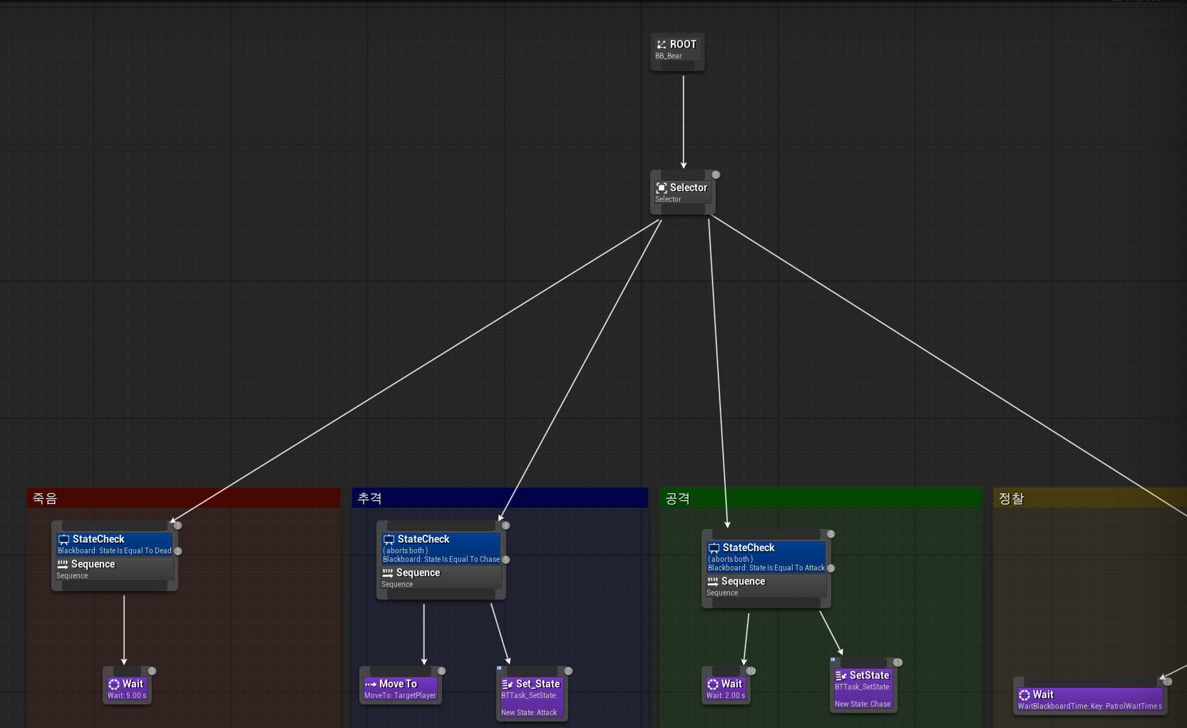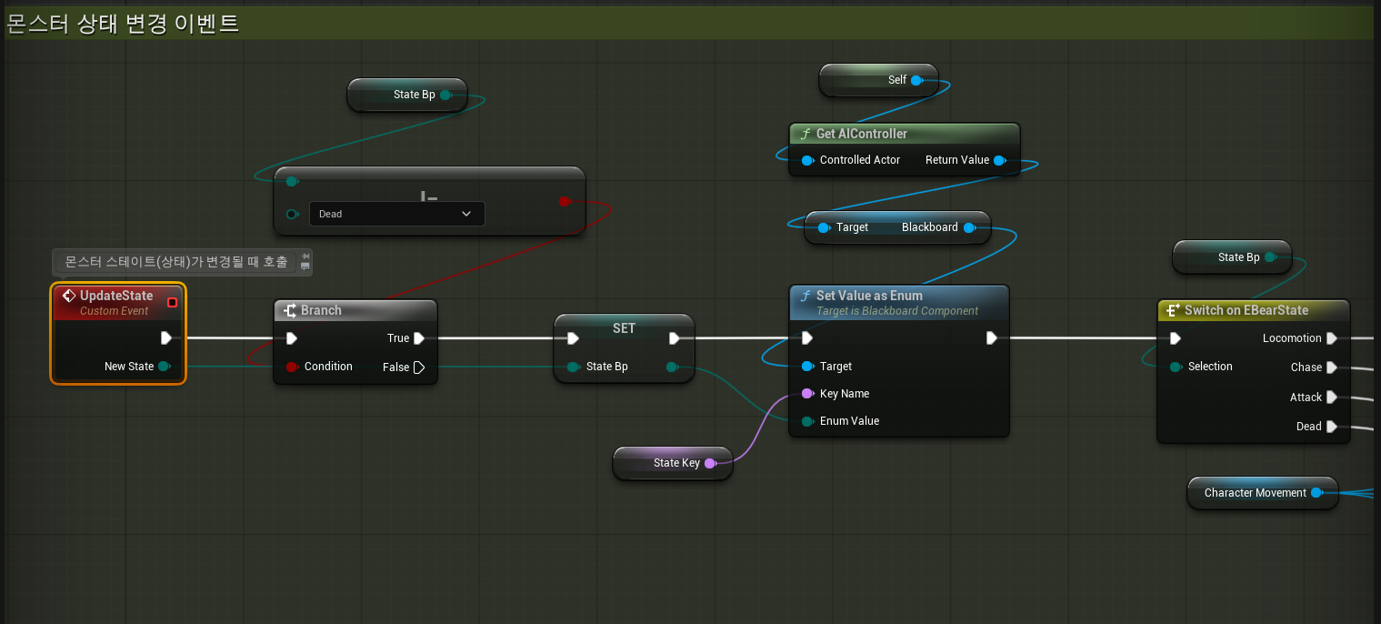 다음과 같이 BP_Bear에서의 state enum값과 blackboard에서의 enum key값을 통해 접근하여 state값을 바꾸어준다.