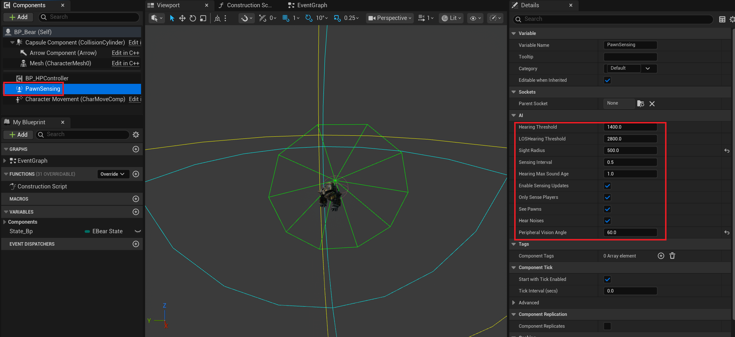 - Pawn Sensing을 BP_Bear의 Component로 추가하기
